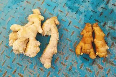 左邊賣相較好的為硫磺燻蒸姜 工業用的硫磺含有鉛、硫、砷等有害物質,在燻製過程中附著在生薑中,食用後會對人體呼吸道產生危害,嚴重的甚至會直接侵害肝臟、腎臟。